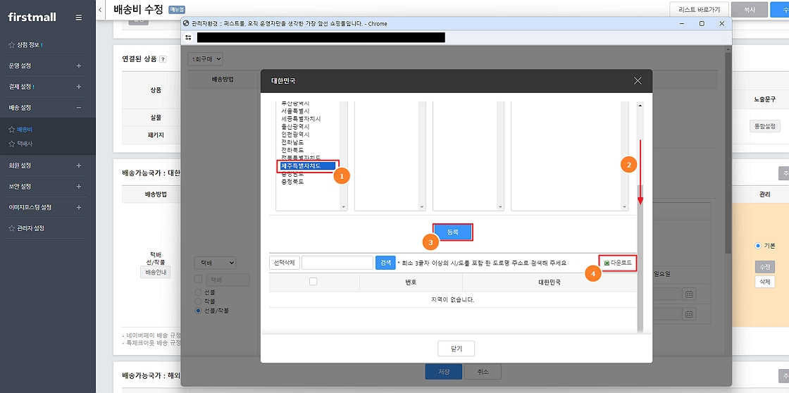 4. 추가 배송비가 적용될 지역 하나를 선택하고 하단의 '등록' 클릭 후 '엑셀 다운로드'를 통하여 양식을 다운로드 받습니다. (등록된 지역이 없으면 경우 엑셀 다운로드가 되지 않습니다.)