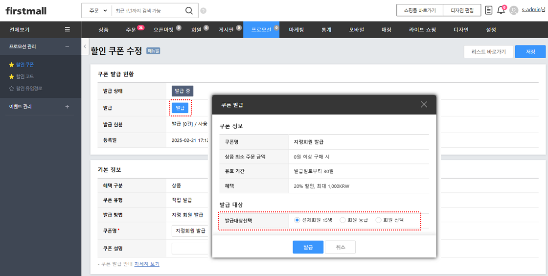 2. 쿠폰 생성후, '발급'을 클릭하여 회원을 지정하여 쿠폰을 발급할 수 있습니다.