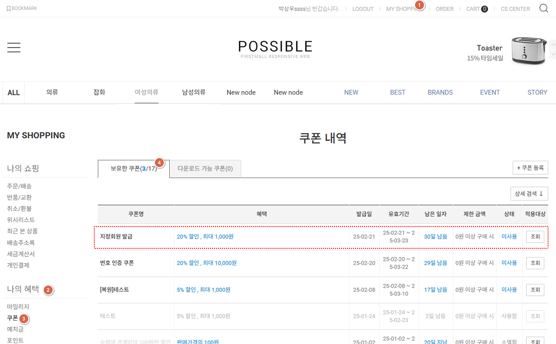 3. 회원은 쇼핑몰 'MY SHOPOOING > 나의 혜택 > 쿠폰' 발급된 쿠폰을 확인할 수 있습니다.