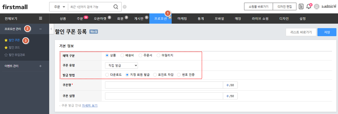 1. '프로모션 > 프로모션 관리 > 할인 쿠폰 > 쿠폰 등록'에서 아래 이미지와 같이 쿠폰혜택구분을 '상품' 또는 '배송비' , 쿠폰유형은 '직접발급', 발급방법을 '지정 회원 발급'으로 선택한 후 혜택 등을 설정하여 쿠폰을 생성합니다.