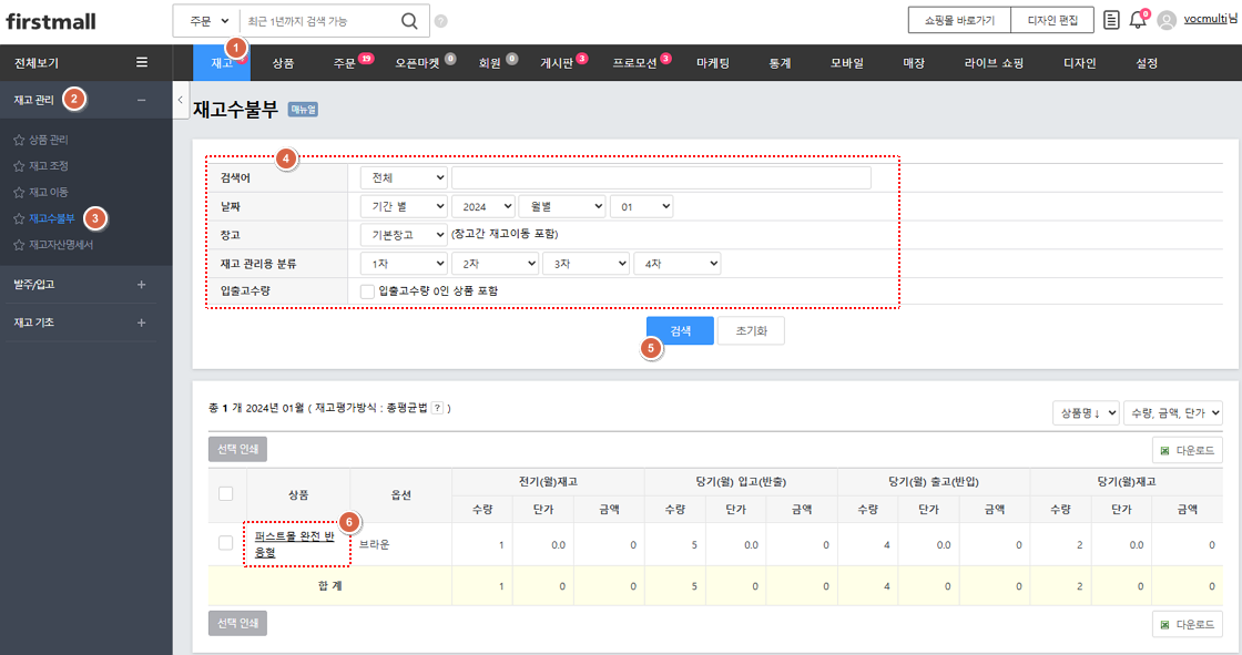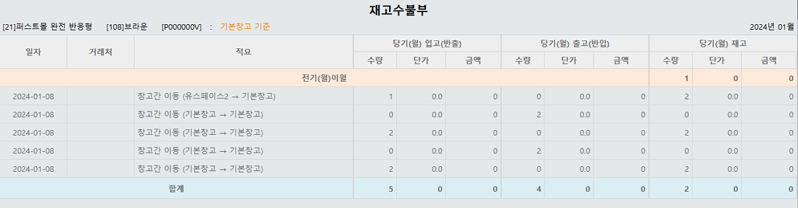 재고수불부를 통해 창고별 / 일자별로 재고 입.출고 내역 확인할 수 있습니다. '재고 > 재고관리 > 재고수불부' 에서 '창고', '기간' 등을 선택하여 조회후 '상품명'을 클릭합니다.