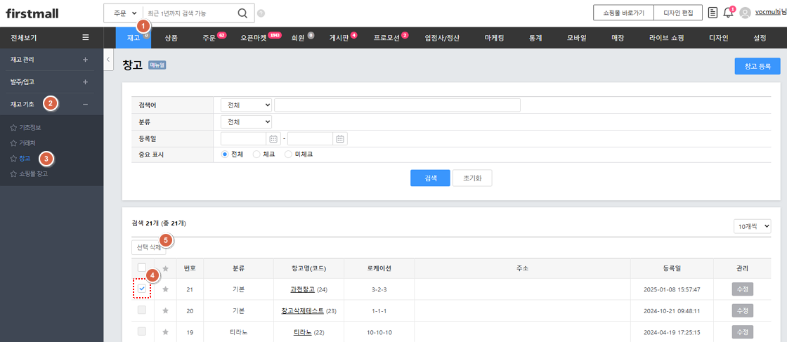 단, 아래 조건의 경우에는 삭제할 수 없습니다. - 입/출고 완료건이 있는 경우 - 완료된 재고조정 및 재고이동이 있는 경우 - 쇼핑몰 창고로 지정이 되어 있는 경우 - 재고가 남아있을 경우