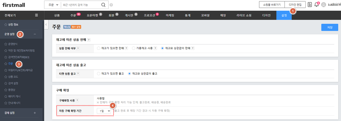 3. 구매 확정: '출고 완료'후에는 일정 기간후 '구매 확정'이 되면서 배송의 상태도 '배송 완료'로 자동 변경 됩니다. '구매 확정'에 대한 기간 설정은 '설정 > 운영 설정 > 주문 > 구매 확정'에서 하실 수 있습니다. 단, '구매 확정' 이후에는 구매자는 쇼핑몰 MY페이지에서 '반품', '교환' 신청을할 수 없기 때문에 기간 설정을 신중하게 하여 주시기 바랍니다.