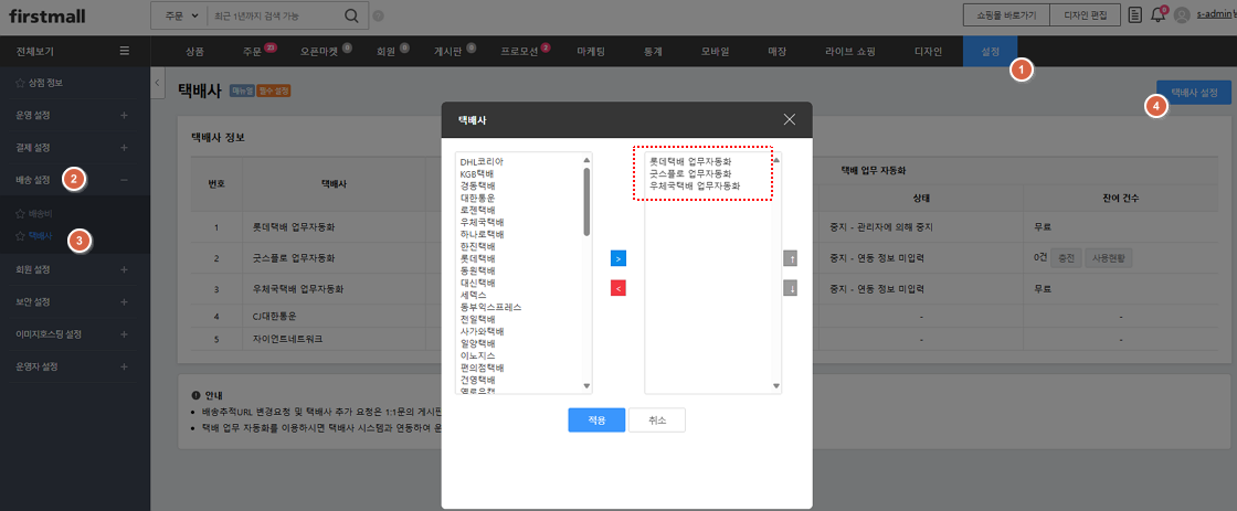 2. 택배 업무자동화: '설정 > 배송 설정 > 택배사'에서 '택배 업무자동화'설정을 하시면 출고완료 후 배송 상태에 따라 자동으로 배송완료 됩니다. (우체국택배 업무자동화FAQ↗, 롯데택배 업무자동화FAQ↗, 굿스플로 택배 업무자동화FAQ↗)