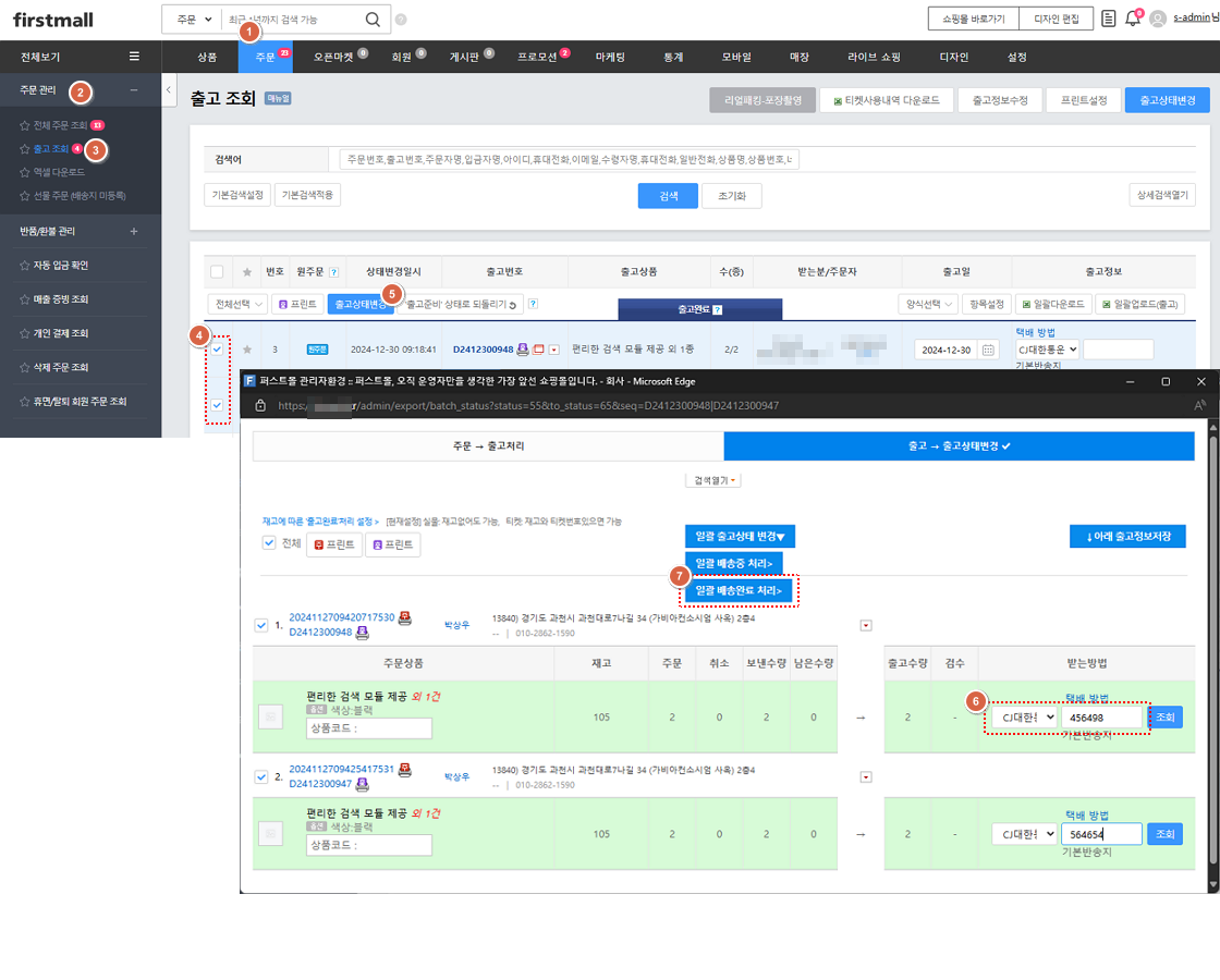 1. 수동 처리: '주문' > 주문 관리 > 출고 조회'에서 배송완료할 출고 건을 선택하여 '출고상태변경'을 진행하시면 됩니다.