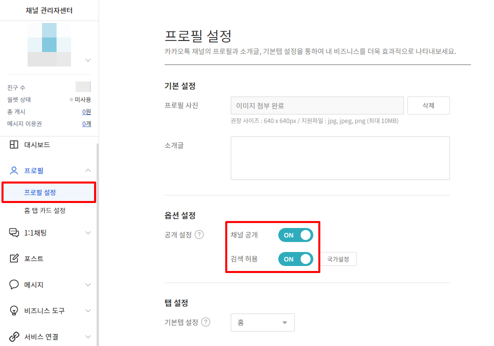 카카오 알림톡 사용을 위해 카카오 채널을 개설한 경우 '프로필 > 프로필 설정'에서 옵션 설정의 공개설정을 '채널 공개', '검색 허용' 모두 ON으로 설정해 주셔야 이용 가능합니다.