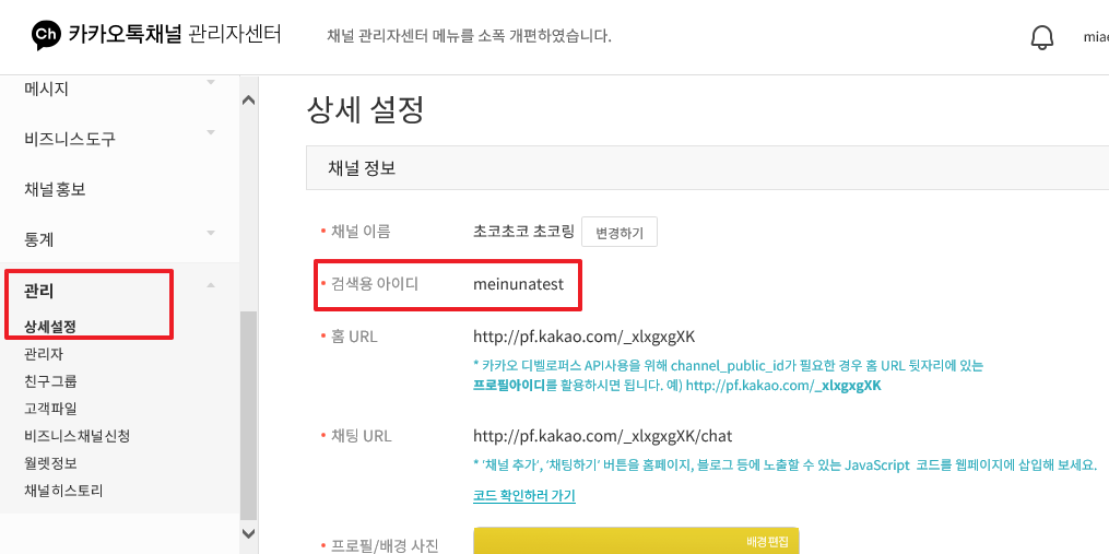 2. 생성한 카카오 채널에 '관리 > 상세 설정'에서 '검색용 아이디'를 확인할 수 있습니다.
