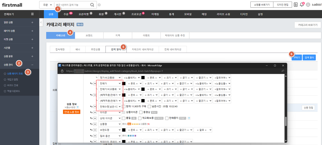 ※ 모든 카테고리를 동일하게 적용할 경우에는 '상품 > 상품 관리 > 상품페이지 조회 > 카테고리 > 검색 필터'에서 '꾸미기'를 클릭하여 적용할 수 있습니다.