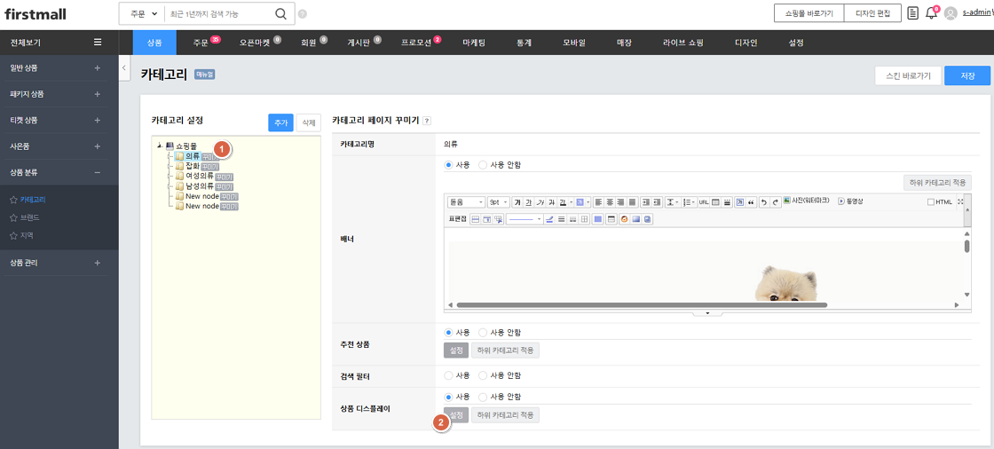 2. 수정하고자 하는 카테고리의 '꾸미기'를 클릭하고, '상품 디스플레이'의 '설정'을 클릭합니다.