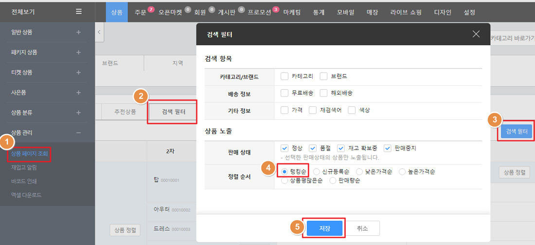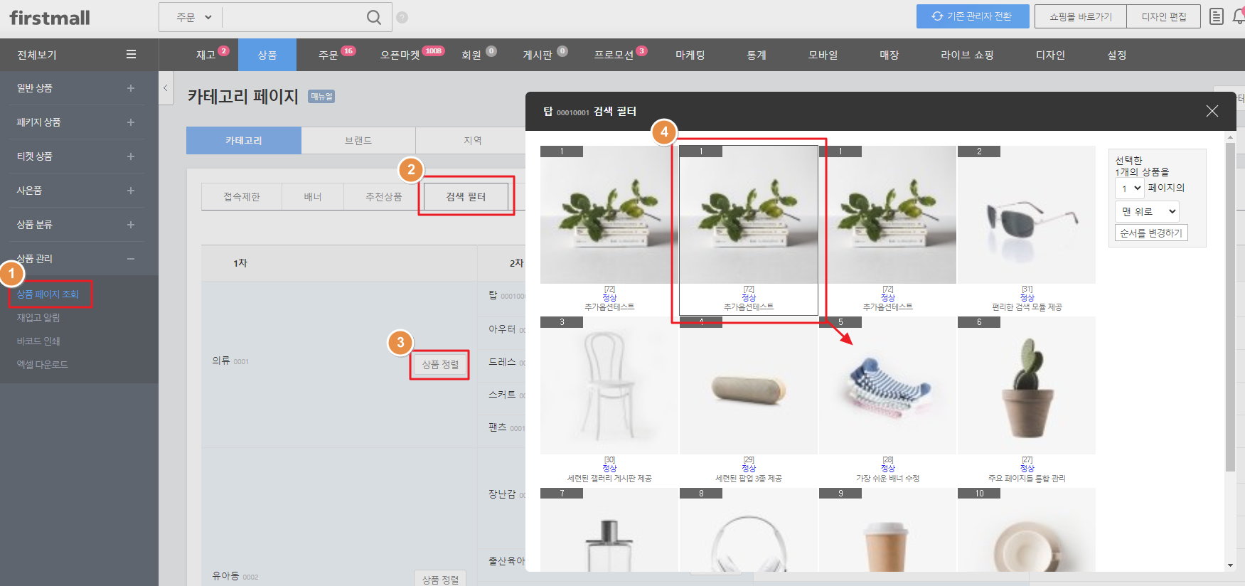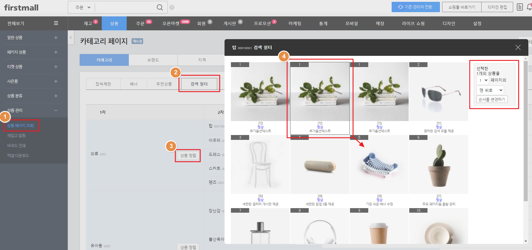 ■ '상품 > 상품 관리 > 상품 페이지 조회 > 카테고리 > 검색 필터'로 접속한 후 '상품 정렬' 클릭 시 상품의 정렬 순서를 변경할 수 있습니다.
