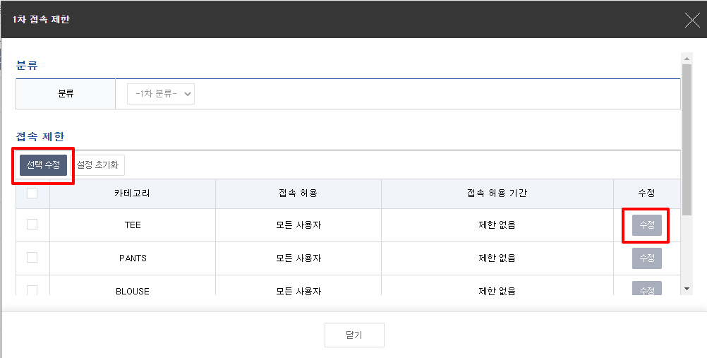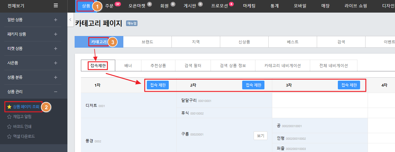 1. '상품 > 상품관리 > 상품페이지조회 > 카테고리 > 접속 제한' 수정하고자 하는 카테고리의 '접속제한'을 클릭합니다.