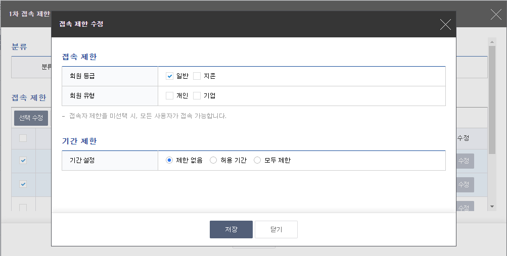 - 접속제한 : 회원등급과 유형을 체크하여 제한설정이 가능합니다. 미선택시 모든 사용자가 접속 가능합니다.