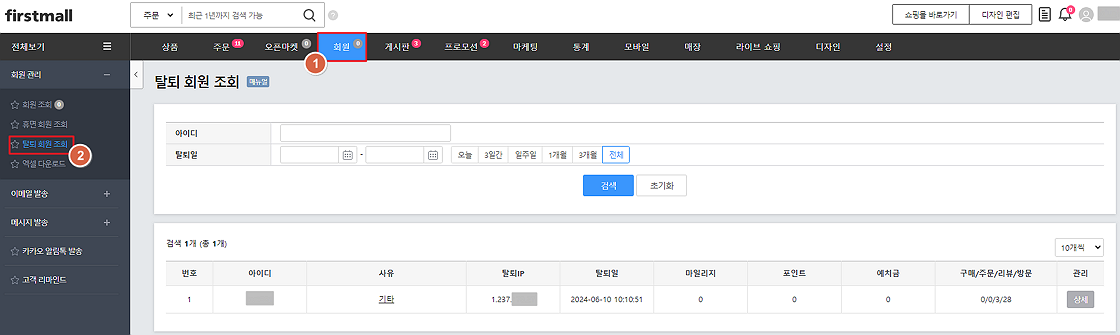 '회원 > 회원관리 > 탈퇴 회원 조회'에서 '아이디'를 검색해보시기 바랍니다.