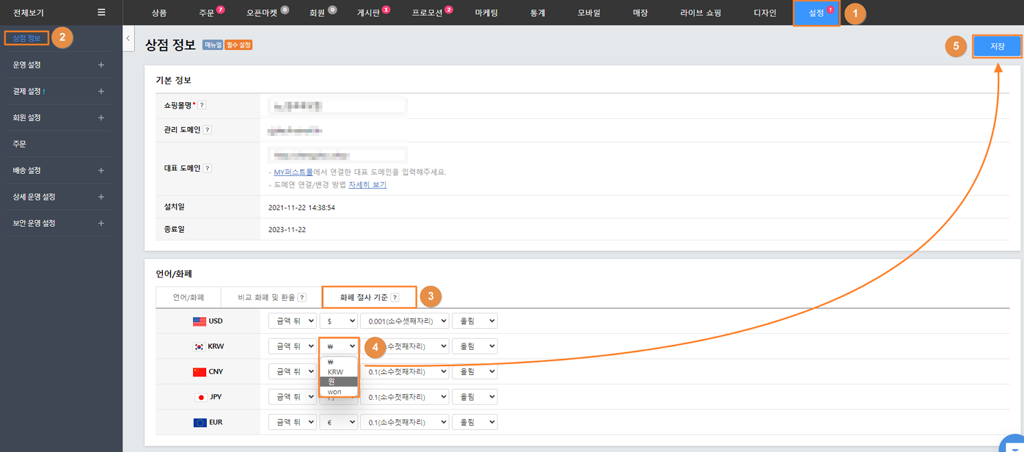 상점 정보의 언어/화폐 메뉴에서 상품 상세 페이지 및 장바구니, 주문 페이지 등 기본 통화표기 수정이 가능합니다.