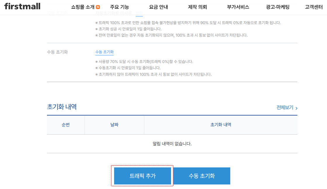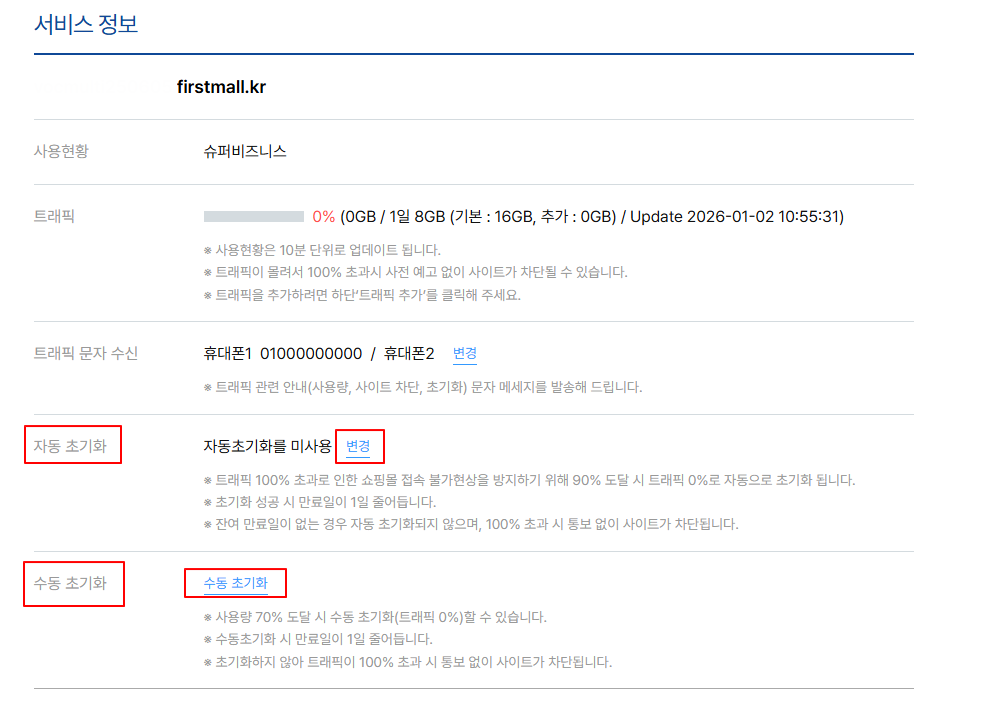 수동 초기화를 진행하지 않아 트래픽이 100%를 초과할 경우,별도 통보 없이 사이트가 차단됩니다.