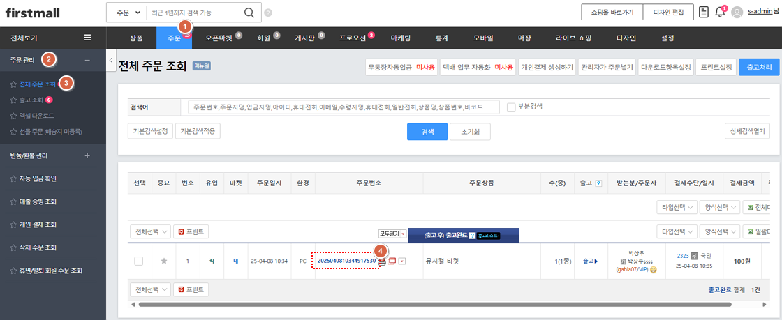 1. '주문 > 주문 관리 > 전체 주문 조회'에서 해당 ‘주문번호’를 클릭합니다.