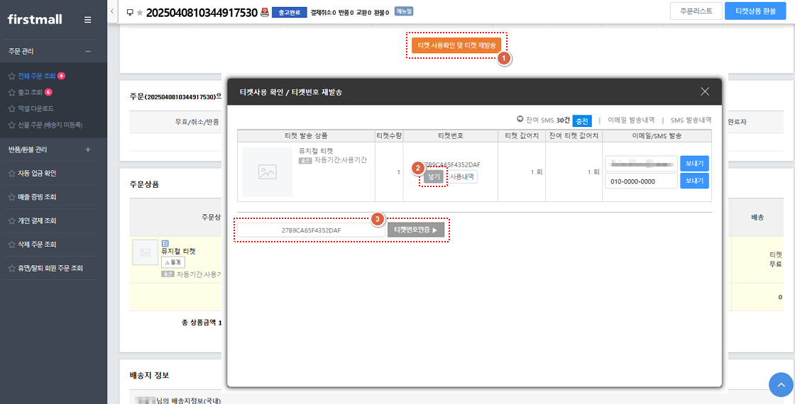 2. ‘티켓 사용확인 및 티켓 재발송’을 클릭한 후에 티켓번호 하단의 ‘넣기’를 클릭하고 ‘티켓번호인증’을 클릭합니다.