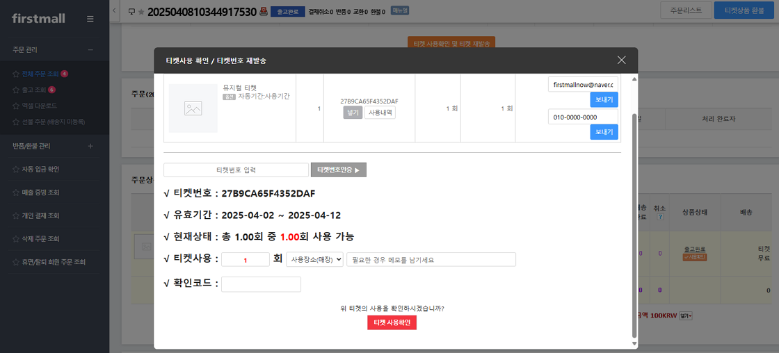 3. 티켓사용 횟수 및 사용장소, 확인코드를 기입하신 후 ‘티켓 사용확인’을 클릭하면 해당티켓상품은 ‘사용 완료’로 변경되며, 주문서의 상태는 ‘배송 완료’로 변경됩니다.