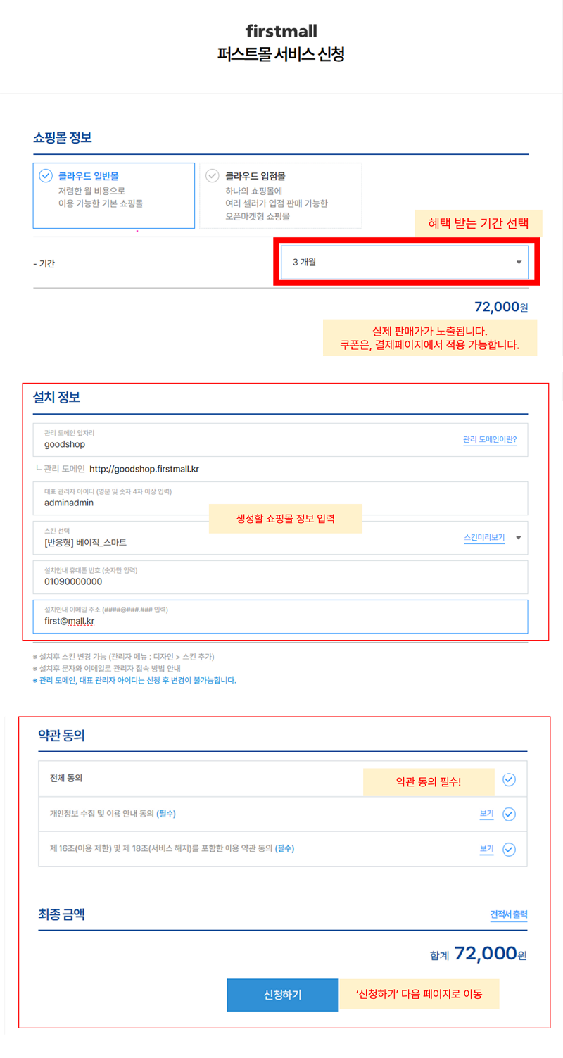 ① 혜택 받는 기간을 선택한 후, 쇼핑몰을 신청합니다.