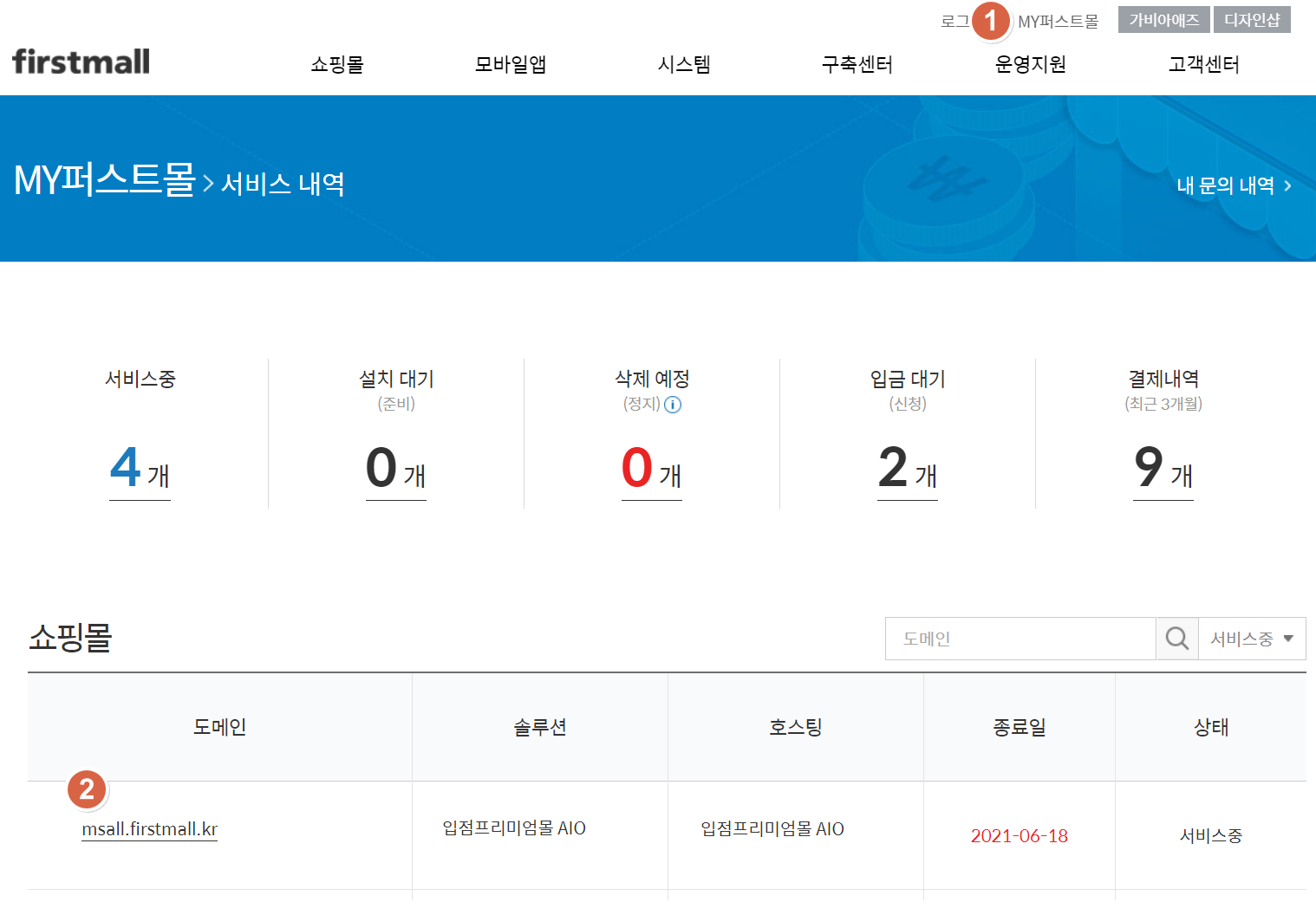 2. 신청하신 쇼핑몰의 도메인을 클릭합니다.