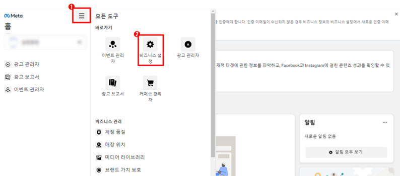 1. 페이스북 비즈니스 관리자↗에 로그인 합니다.