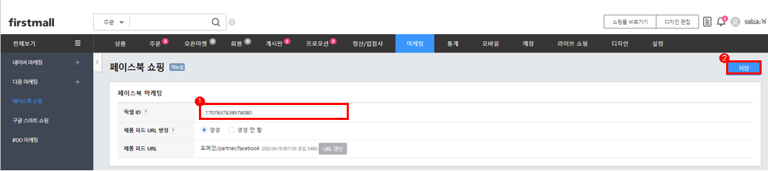 6. 복사한 픽셀ID를 '마케팅 > 페이스북 쇼핑 > 픽셀ID'에 입력 후, 저장합니다.