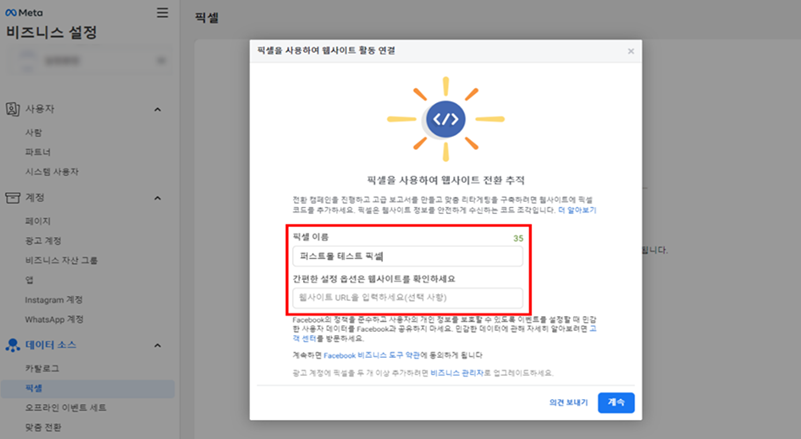 4. 픽셀 이름과 웹사이트 URL 입력한 후 '계속'을 클릭합니다.