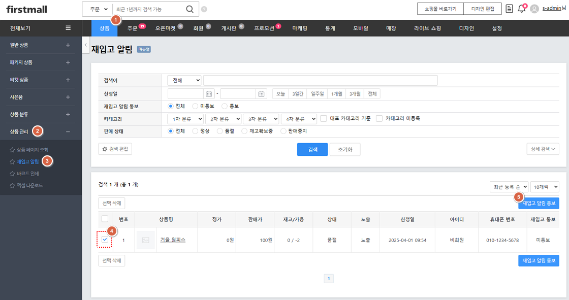 [상품 > 상품 관리 > 재입고 알림]에서 재입고 알림 신청을 한 회원에게 재입고 알림 문자를 발송할 수 있습니다.