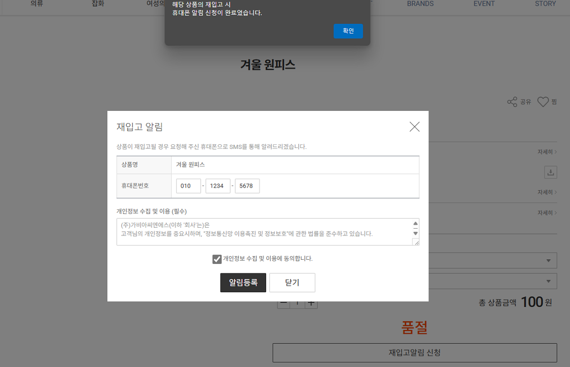 ※ 상품 상세화면에서 소비자가 재입고 알림 신청 화면