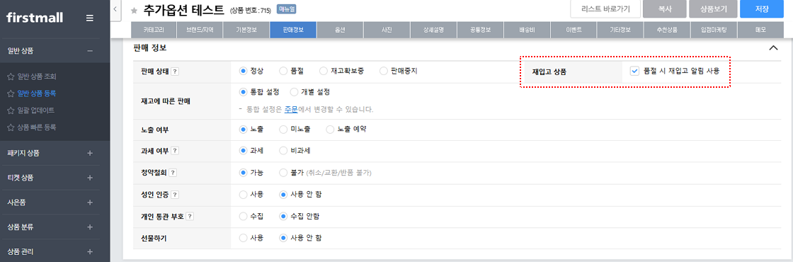 먼저 상품 '품절 시 재입고 알림 사용'에 체크하여 상품을 저장해 주셔야합니다.