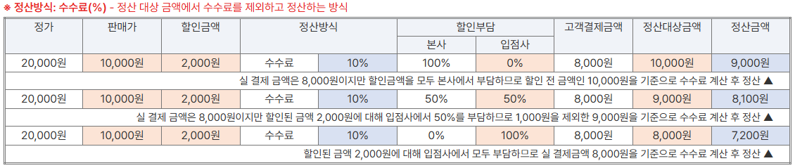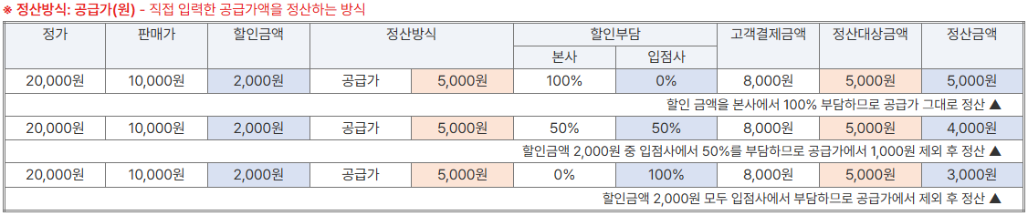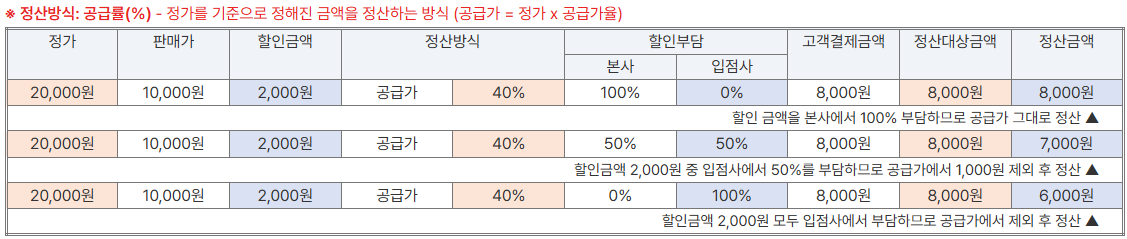 할인이벤트, 할인쿠폰 등 프로모션을 통한 할인 설정 시 본사와 입점사 부담률을 설정하실 수 있습니다.입점사 정산방식 및 할인 부담률에 따른 계산방식은 아래 표를 참고하여 이용해 주시기 바랍니다.