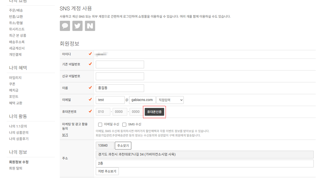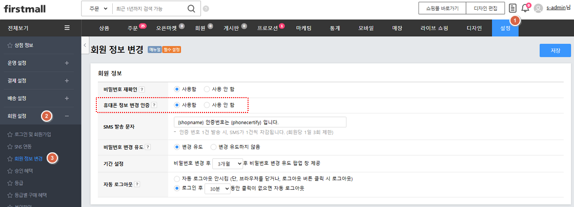 '설정 > 회원 설정 > 회원정보 변경'에서 휴대폰 정보 변경 인증을 설정할 수 있습니다.