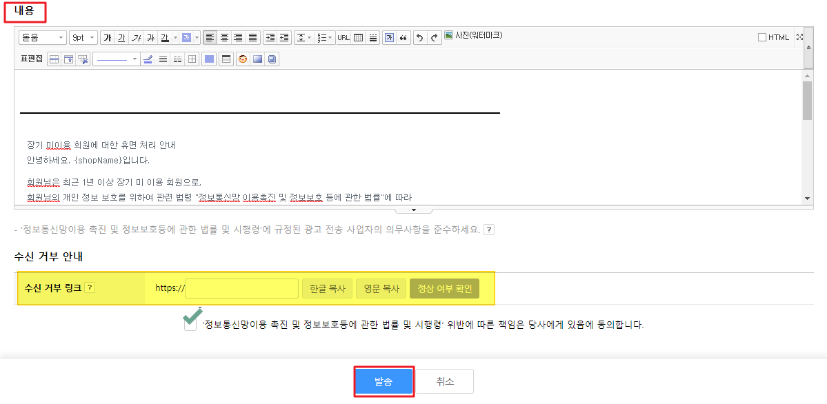 4. 메일 내용 하단의 수신거부 링크 안내의 수신거부 링크를 복사하여 메일 내용에 입력합니다.