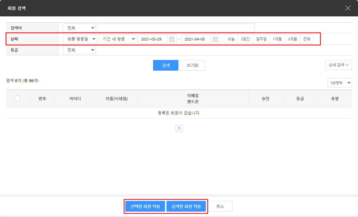 3. 날짜 최종방문일, 기간내 방문일 '1년전 일주일'로 날짜가 설정, 바로 검색 또는 방문일 날짜를 조정하여 '검색'해주시고, 검색결과에 따라 '선택한 회원 적용' 또는 '검색한 회원적용'을 통해 대상을 선택해주시기 바랍니다.