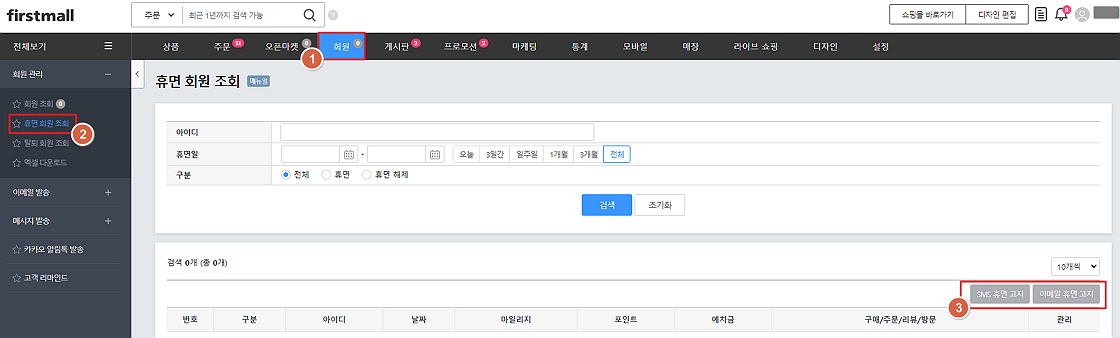 1. '회원 > 회원관리 > 휴면 회원 조회'에서 '이메일 휴면고지'을 클릭합니다.