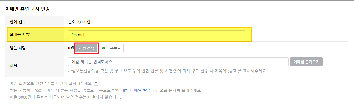 2. 이메일 발송창이 뜨면 보내는 이메일 주소를 입력 후, '회원검색'을 클릭합니다.