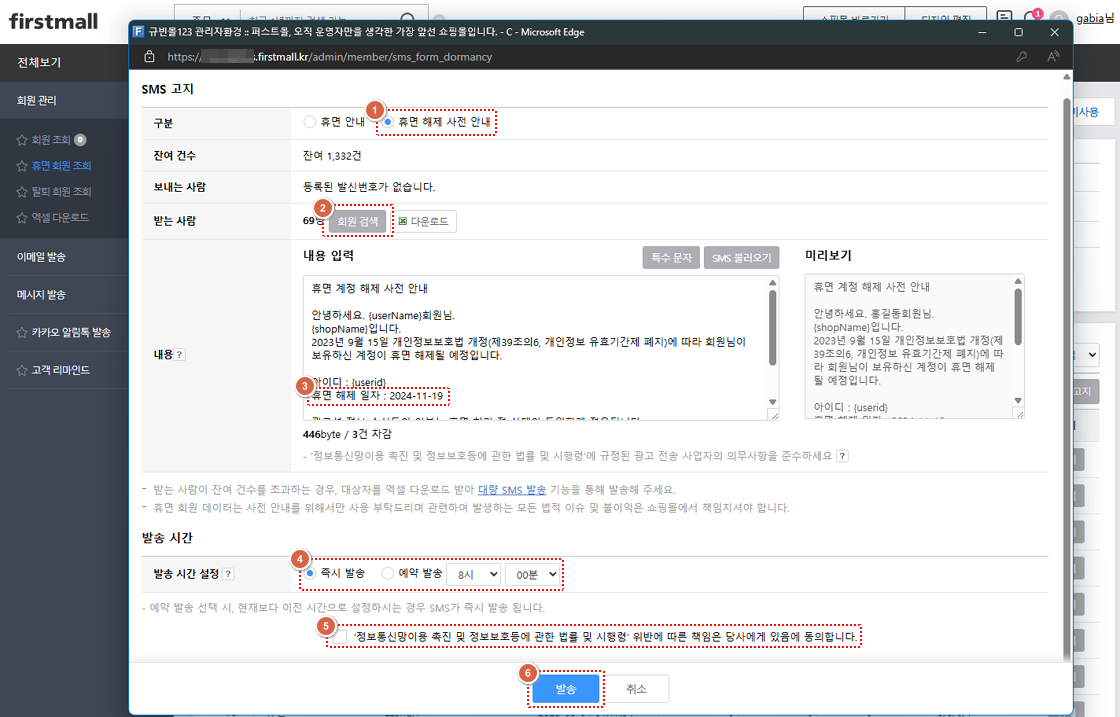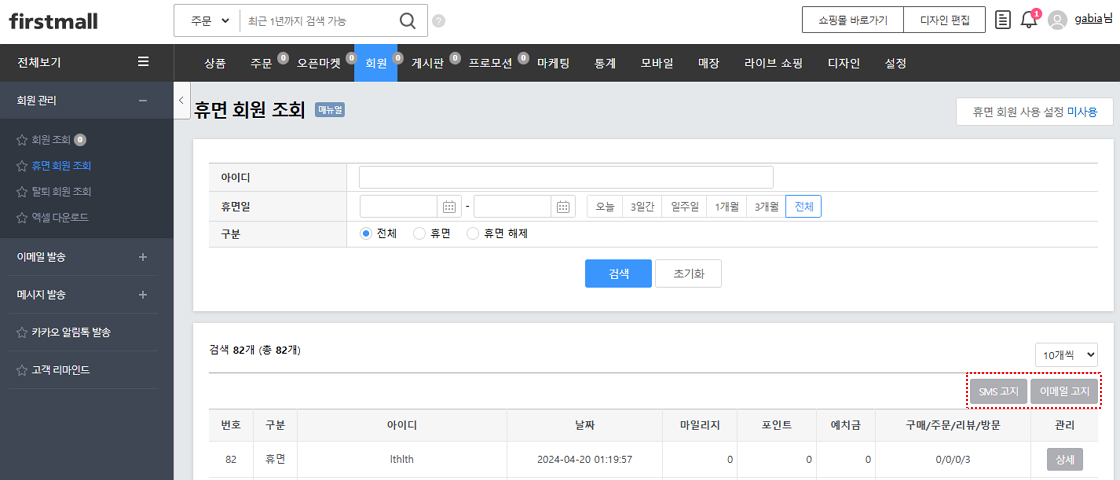 '회원 > 회원 관리 > 휴면 회원 조회'에서 'SMS'와 '이메일'로 고지를 진행할 수 있습니다.