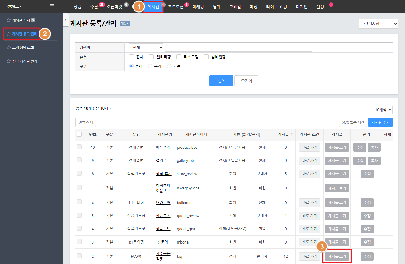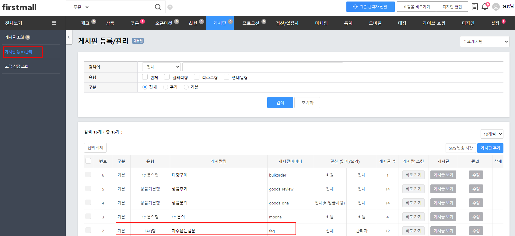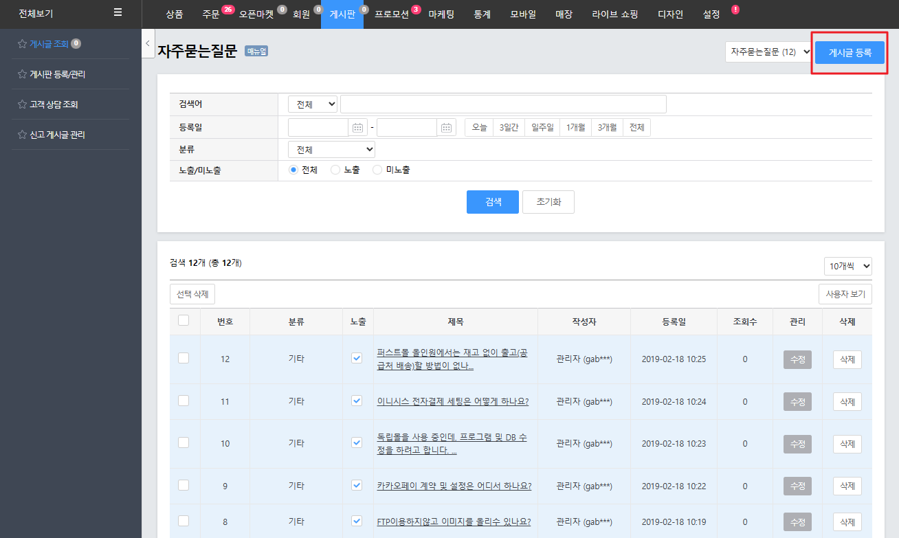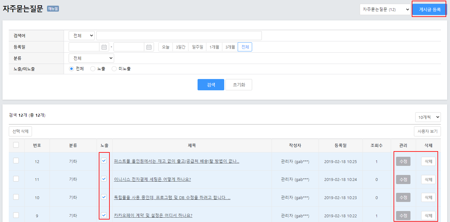 게시글 등록1. '게시판 > 게시판 등록/관리'로 접속 후 FAQ 게시판의 '게시글 보기'를 클릭합니다. 2. '게시글 등록'을 클릭하여 FAQ를 작성할 수 있습니다.게시글 수정1. '게시판 > 게시판 등록/관리 > 자주 묻는 질문 게시판(게시판 ID : faq)'의 '게시글 보기'를 클릭합니다. 2. 기존 게시글을 수정하거나 삭제, 또는 노출 여부를 설정할 수 있으며 오른쪽 상단 게시글 등록을 클릭하여 게시물을 등록할 수 있습니다.