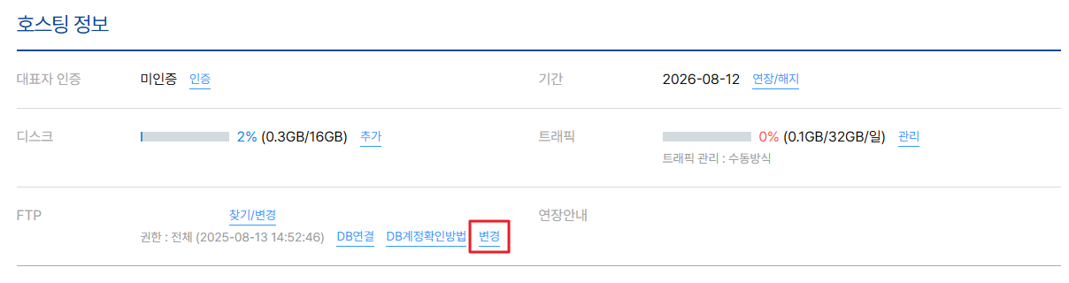 호스팅 정보의 FTP > 변경 버튼을 클릭합니다.