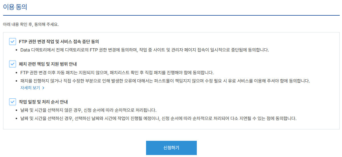 이용 동의 항목을 정독하고, 항목 체크 후 '신청하기' 버튼을 클릭합니다.