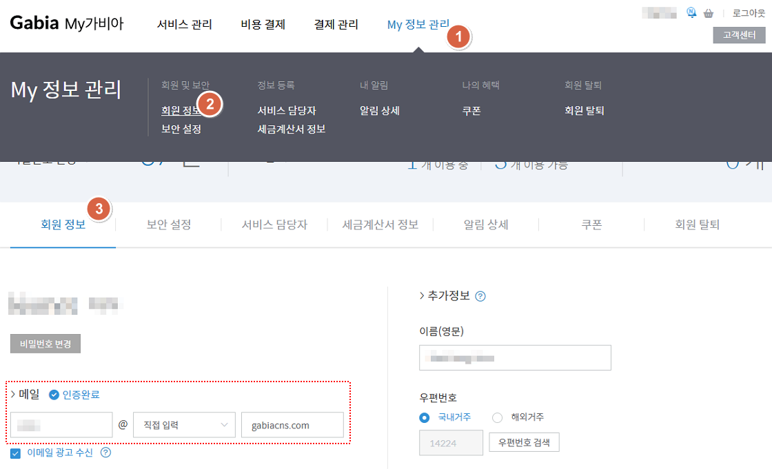 My가비아 > My정보관리 > 회원정보의 이메일 정보를 수정해주시기 바랍니다.