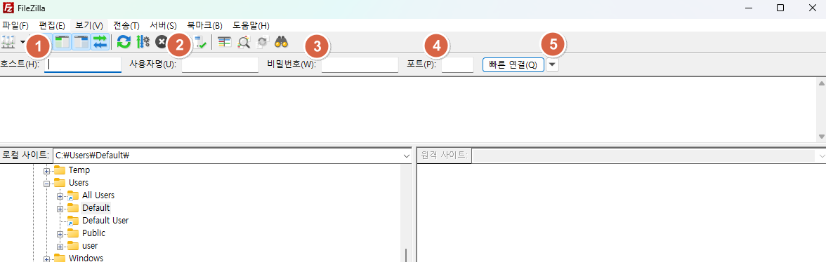 FileZilla 프로그램 실행 후 접속 정보를 입력하여 연결을 시도합니다.