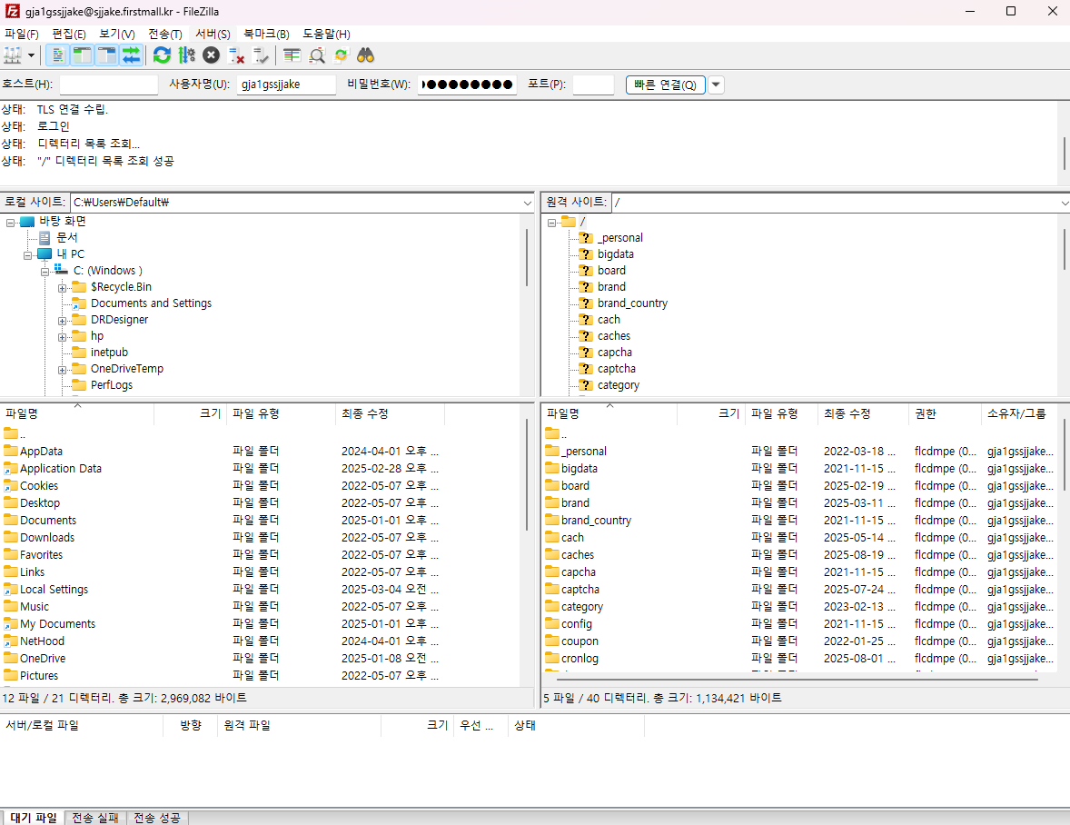 좌측은 PC, 우측은 서버 입니다. PC와 서버간의 파일이동을 자유롭게 하실 수 있습니다.