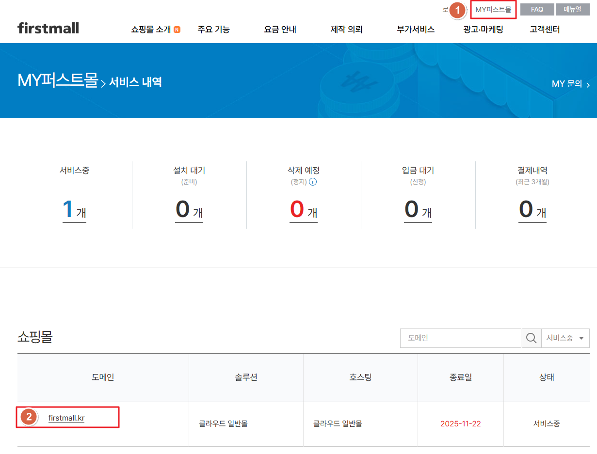 FTP 접속정보는 퍼스트몰 홈페이지에 로그인 후 MY퍼스트몰에서 확인이 가능합니다.