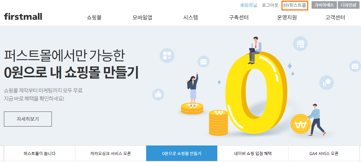 1. 퍼스트몰 홈페이지에 로그인을 진행하며, 로그인 시 가비아 계정을 이용해 주시기 바랍니다. 로그인 후 우측 상단의 MY퍼스트몰을 클릭합니다.