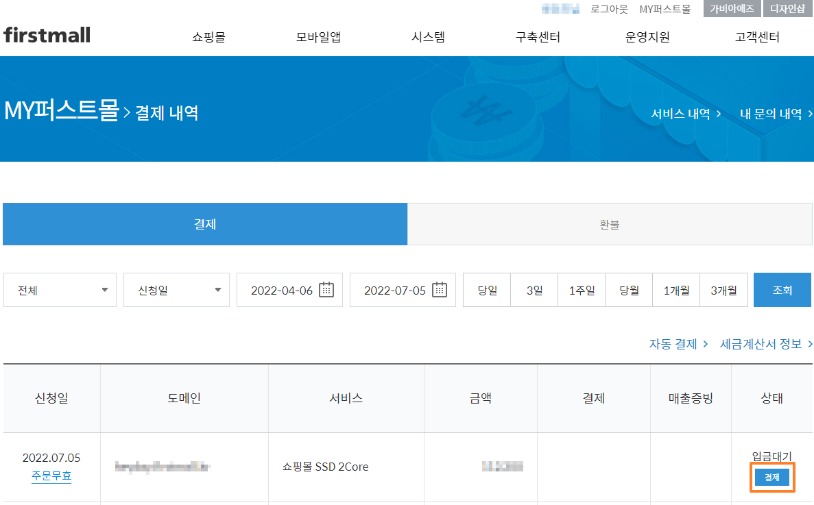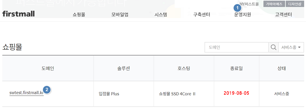 1. 퍼스트몰 홈페이지에서 'MY퍼스트몰↗'로 접속 후 사용중인 도메인을 클릭합니다.