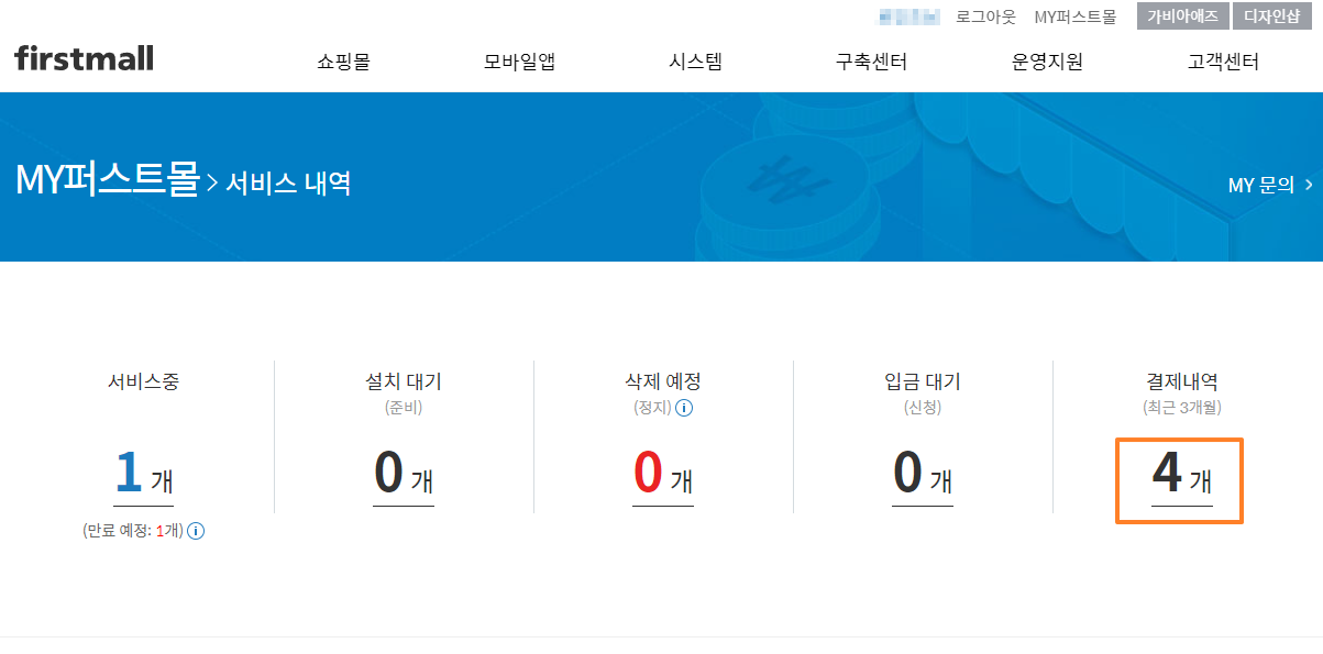 2. 서비스 내역으로 이동하며, 결제내역 항목에서 결제 진행예정인 건을 확인하실 수 있습니다. 이때 확인되는 결제 건 카운트를 클릭합니다.